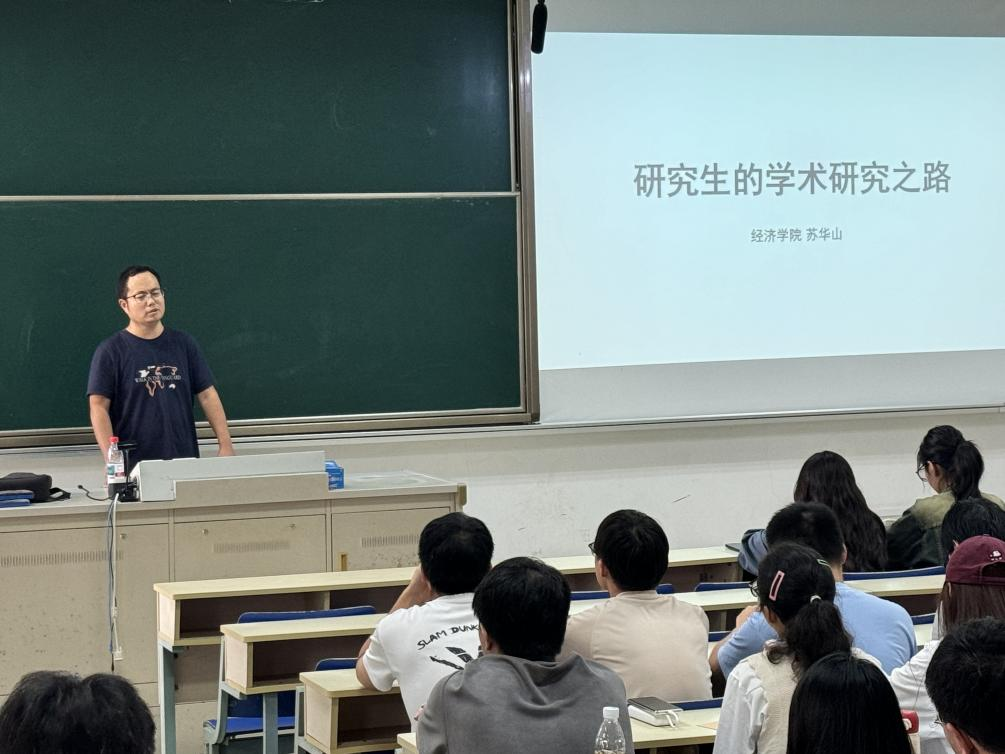为帮助研究生明晰学术研究方向、科学规划科研路径,10月15日下午,我院于德经楼112教室成功举办 “经济学院名师导学大讲堂” 专题讲座。本次讲座特邀我院苏华山副教授担任主讲人,学院辅导员栾亮老师主持讲座,部分研究生到场聆听学习,现场学习氛围浓厚。